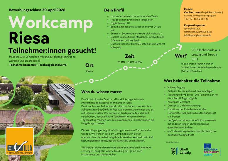 Das Soziokulturelle Zentrum »Die VILLA« organisiert ein internationales inklusives Workcamp in Riesa. Dafür suchen wir Teilnehmende, die Lust haben, zwei Wochen auf dem alten Gut Göhlis in Riesa zu arbeiten, zu wohnen und es mit Leben zu füllen. Wir werden im Garten arbeiten, das Gut verschönern, handwerkliche Tätigkeiten lernen und einen Tagesausflug machen, um den europäischen Teilnehmenden die Umgebung zu zeigen.
