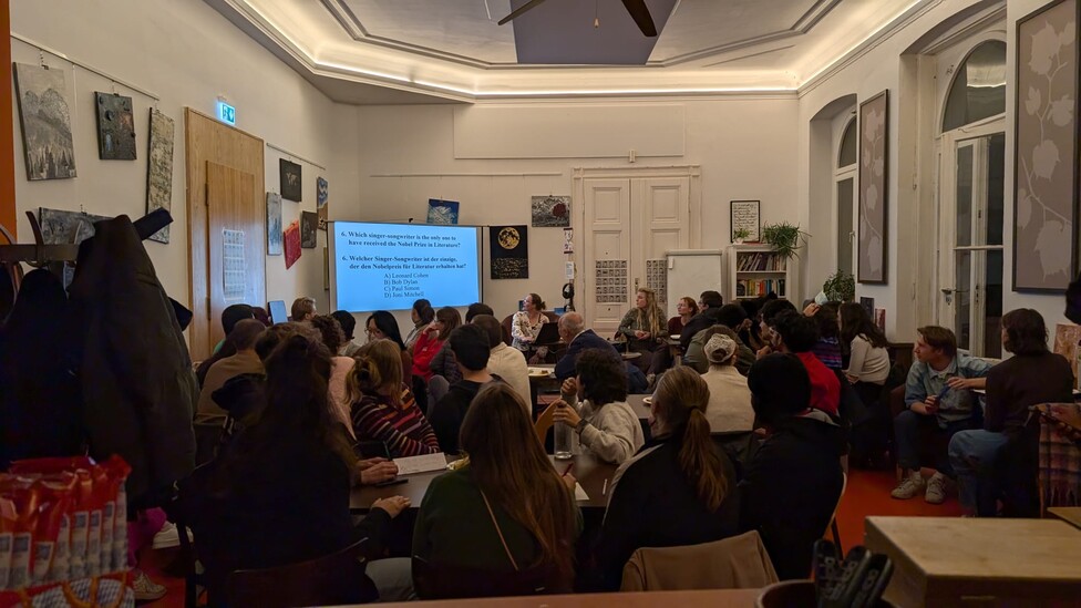 DE: Tolle Fragen, eine großartige Quizmasterin und eine fantastische Stimmung: as hatten wir am 21.10. im Villa Café! Viele leidenschaftliche Teams waren dabei: Eines hatte 8 Mitglieder, ein anderes nur 2. Ganz überraschend hat das Team mit den wenigsten Mitgliedern den Quizabend gewonnen.